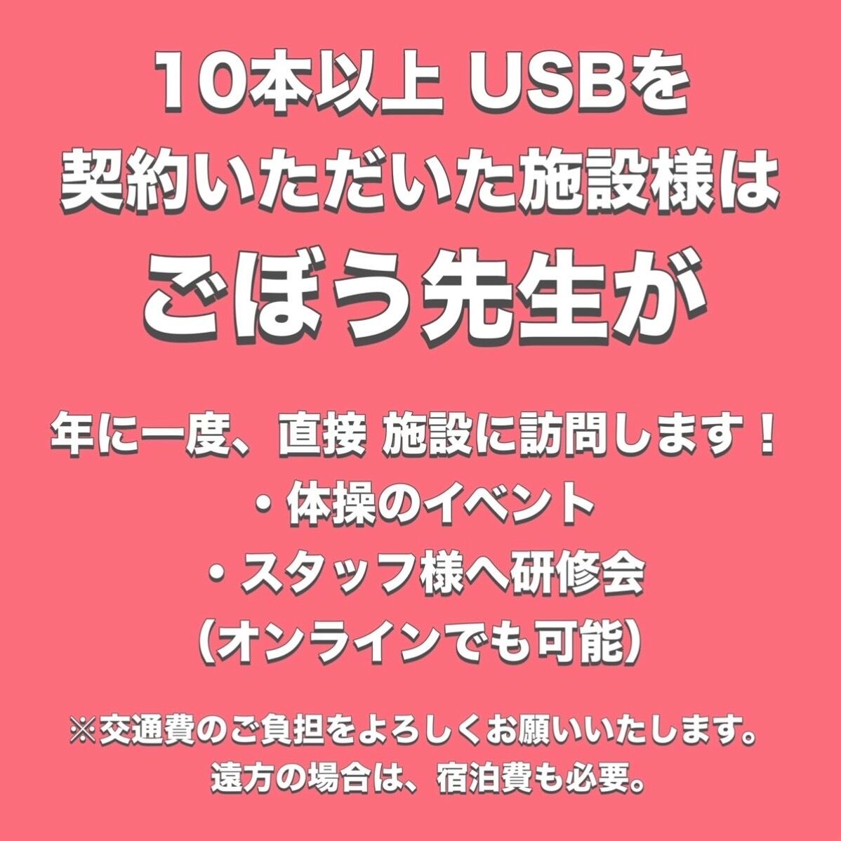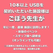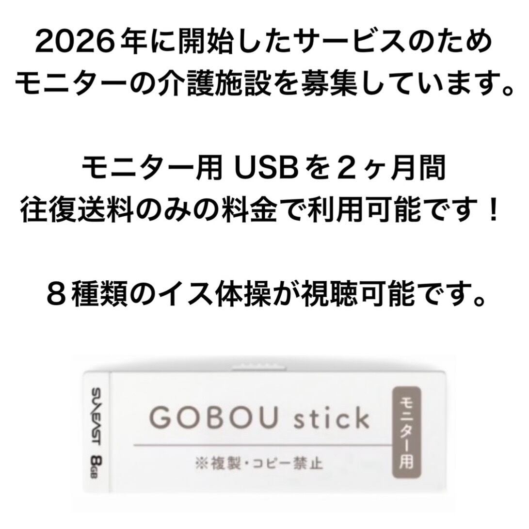 モニター用 USBには、8本の「ごぼう先生のイス体操」が含まれています。体操は全てYouTubeで視聴可能です。USBのメリットは、広告が流れないこと。権利が明確になっていることです。介護施設様、デイサービス様、地域サロン様などでご活用いただけます。本契約の場合、20種類以上のイス体操が導入されたUSBをお送りいたします。